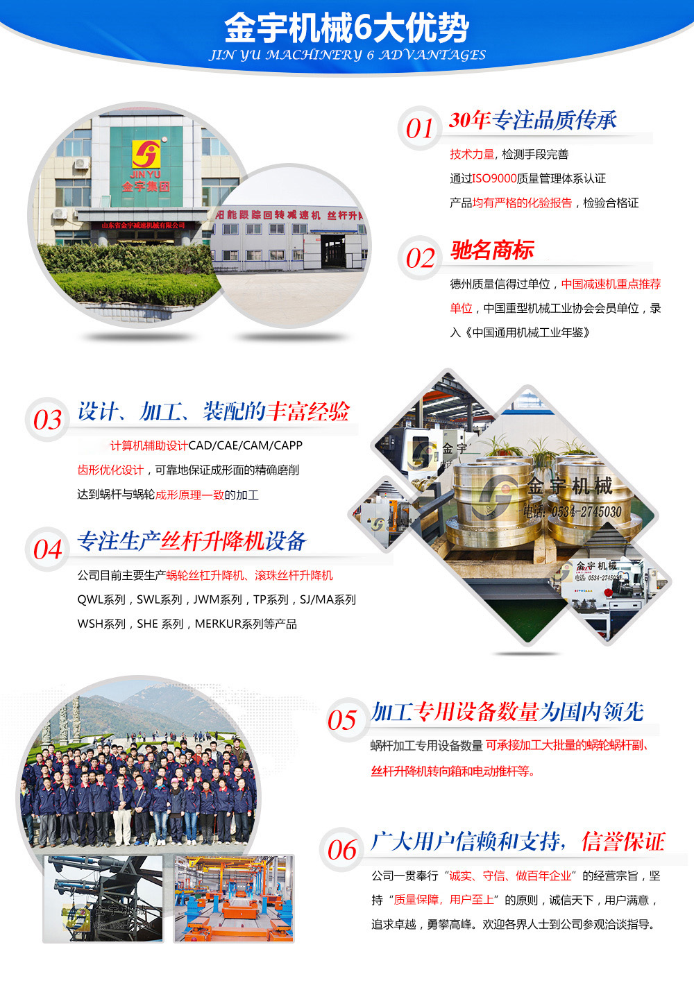 金宇機械生產(chǎn)滾珠絲桿升降機、絲桿升降機、QWL蝸輪絲桿升降機、JWM絲桿升降機、回轉(zhuǎn)減速機等產(chǎn)品。